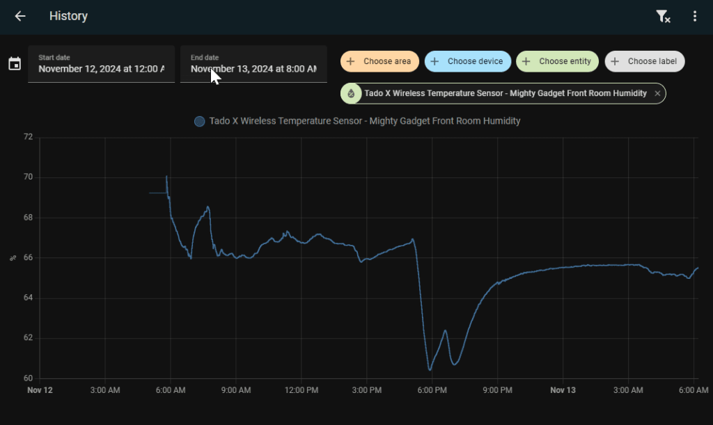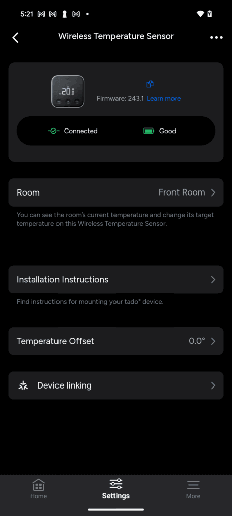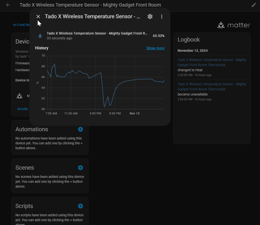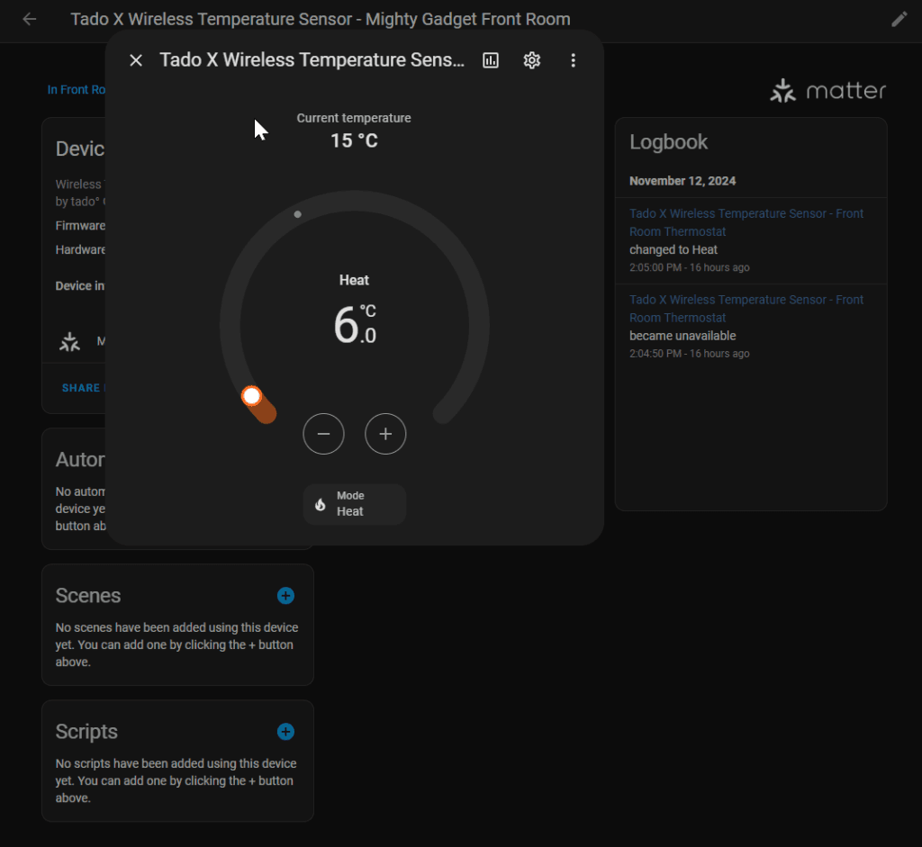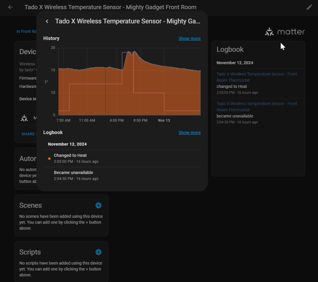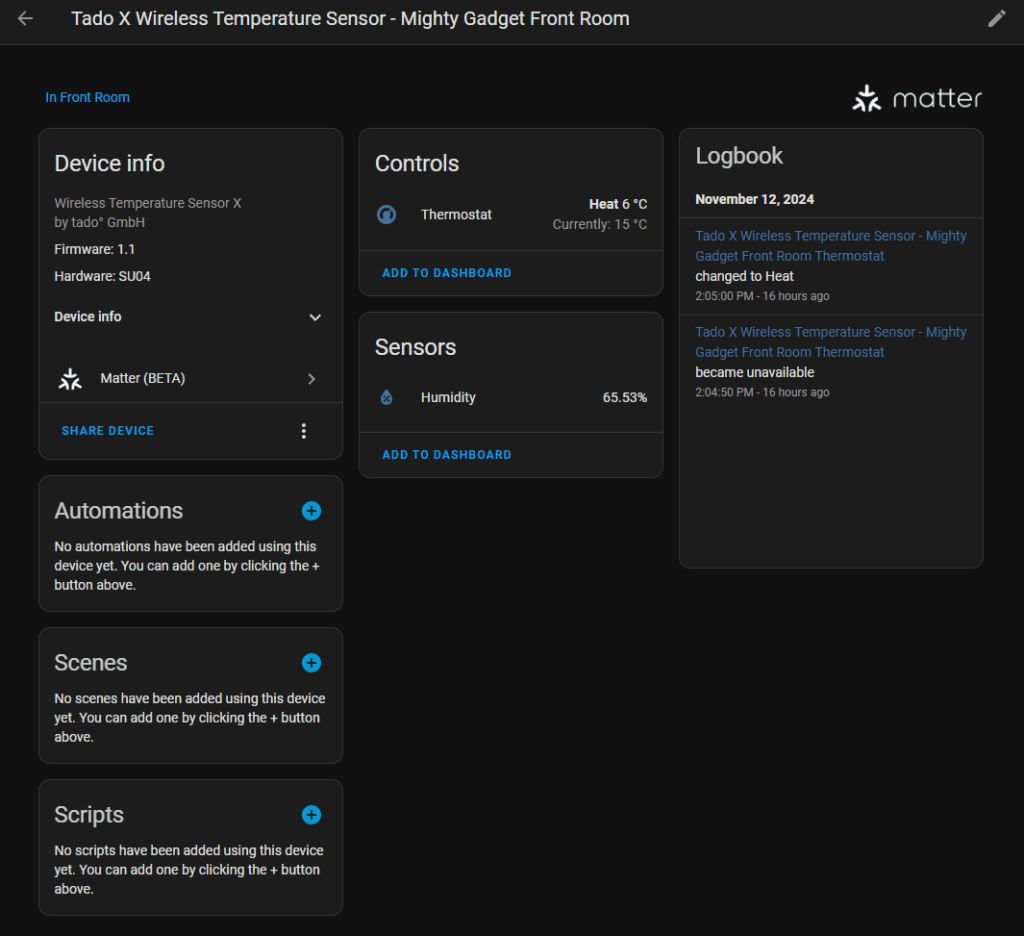 Once added to Home Assistant, you only have access to the heat and humidity sensor plus the thermostat controls, whereas the Tado V3+ API integration gives you access to all the data. This issue is Matter-related rather than Tado. Matter is still in its infancy, and its functionality is improving all the time with Matter 1.4, the most recent release. I find most of this information unnecessary, so I don’t personally mind it not being there.
