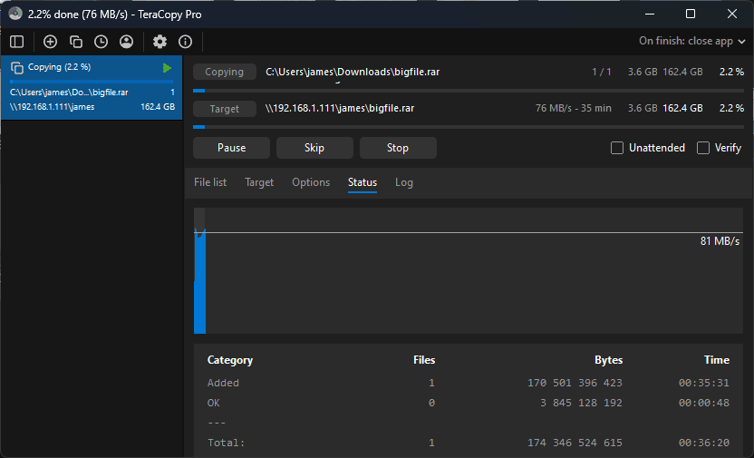 I did a few tests to check the throughput for this NAS and was pleasantly surprised. Transferring a large file to the 10GB Western Digital drive I had installed, I was able to achieve a throughput of up to 75MB/s. That’s not quite saturating the gigabit NIC, but it is an acceptable speed.