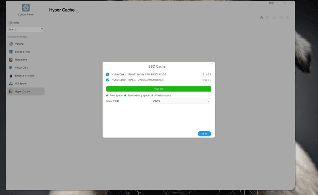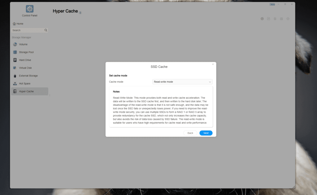 With the upgrade to TOS 5 there is now a new Hyper Cache option. This has a dedicated section within storage manager. With this, you have more control over how the cache works, such as balanced, rear or read/write mode. You also have the option to use RAID 1/0 on two NVMe drives.