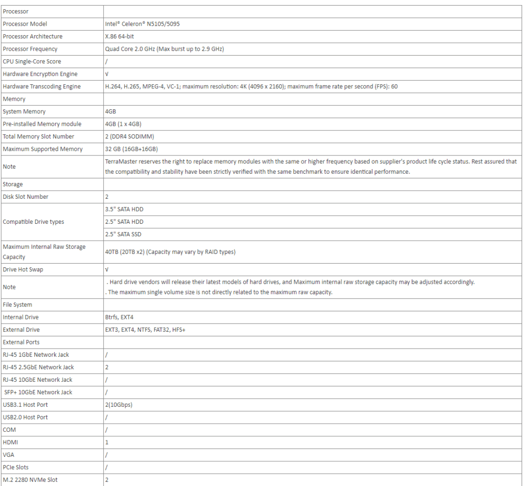 The TerraMaster F2-423 has two M.2 slots which can support NVMe drives. It also uses DDR4 SODIMM slots with 4GB pre-installed.