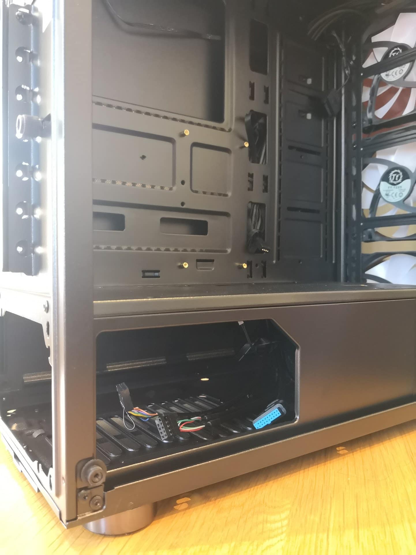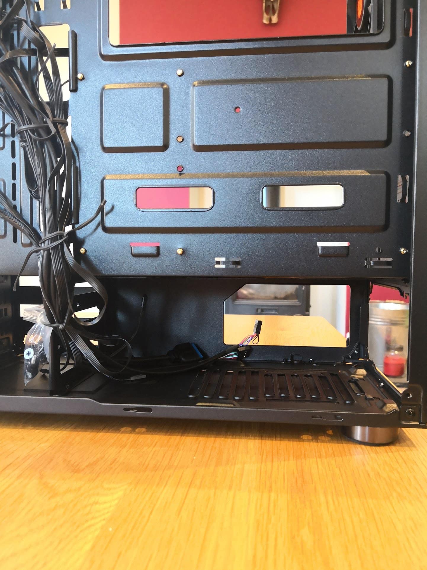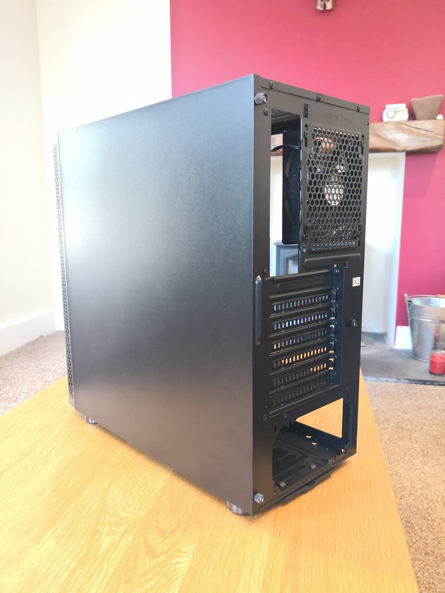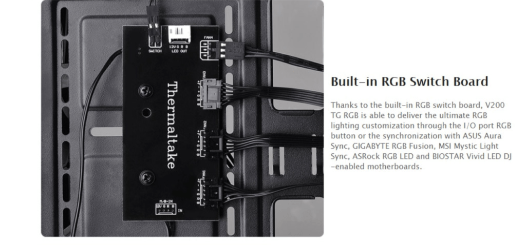 Similar to the 22 this has a full-length 4mm tempered glass panel on the left side, which is held on with thumbscrews in each corner. The right-hand side uses an old-fashioned slot on metal side. Unlike some of the more expensive options which use hinges, this is held into place with thumb screws.This also has a full-length power supply cover that provides plenty of space to tuck away cables, while keeping airflow clear for your hard drives and PSU.Size and overall build quality are mostly the same. The View 22 has a nice plasticy wavy front which some people may find more aesthetically pleasing, whereas the V200 has a traditional flat rectangular shape.Beyond that, they do start to differentiate, and the V200 has several extras making it an appealing option. The flat front panel is clear acrylic and behind this sits three 120mm RGB fans and an included fan controller which can be controlled manually using the RGB button on top or via motherboard with LED control in them. The various RGB control options for motherboards includes: ASUS Aura Sync, GIGABYTE RGB Fusion, MSI Mystic Light Sync, ASRock RGB LED and BIOSTAR Vivid LED DJ.
