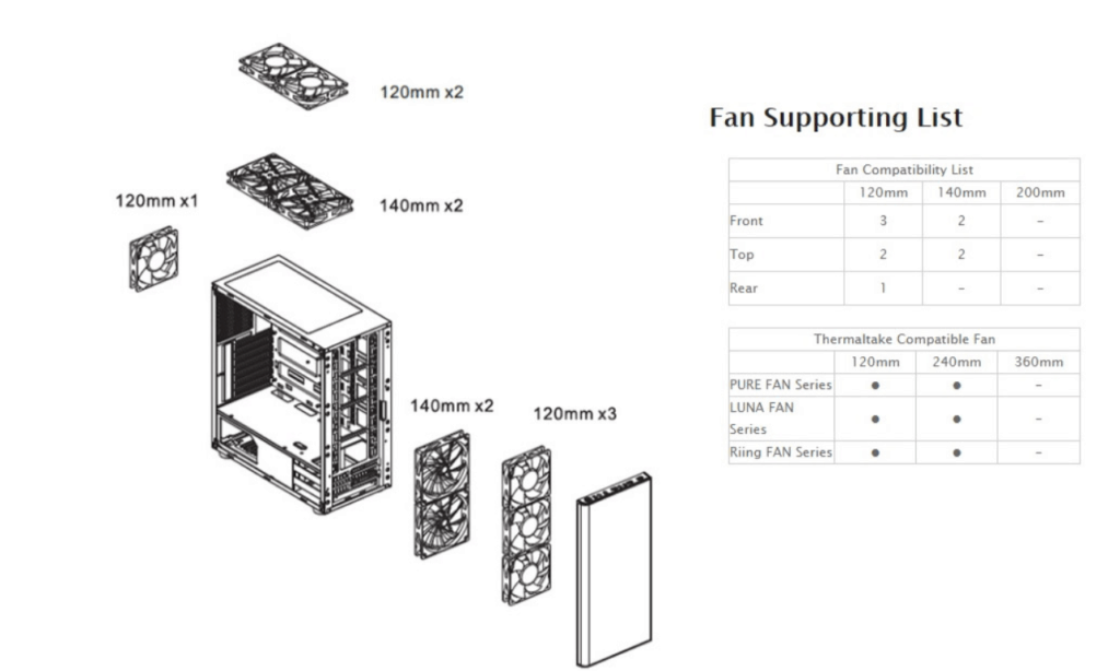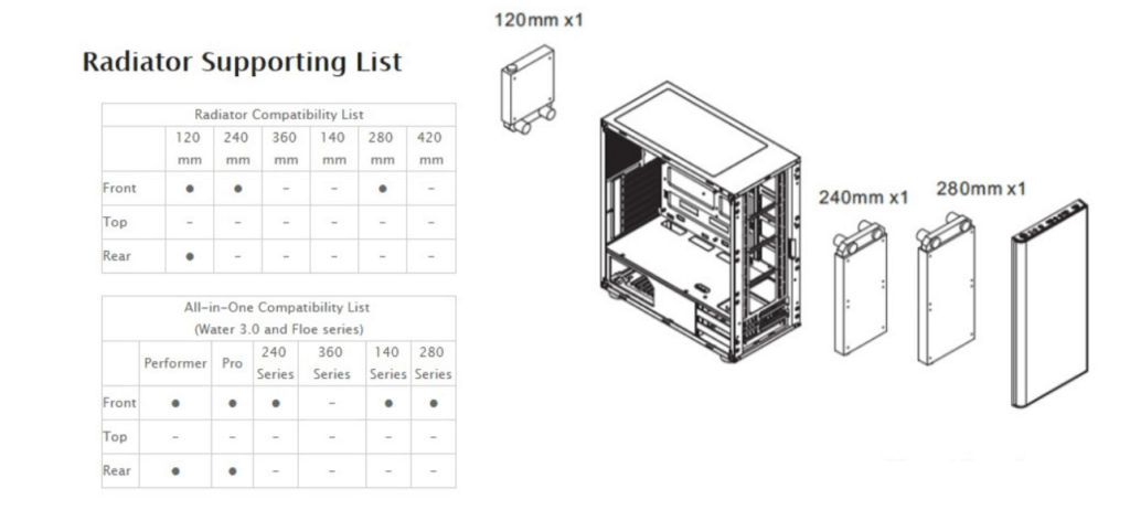 You can also optionally had two 140/120mm fans in the top, and the top can accommodate a 280mm radiator behind the front panel, which is cooled by intake on the right side.Motherboards are supported up to o ATX size, tower CPU coolers with a maximum height of 160mm, and VGA length of up to 380mm