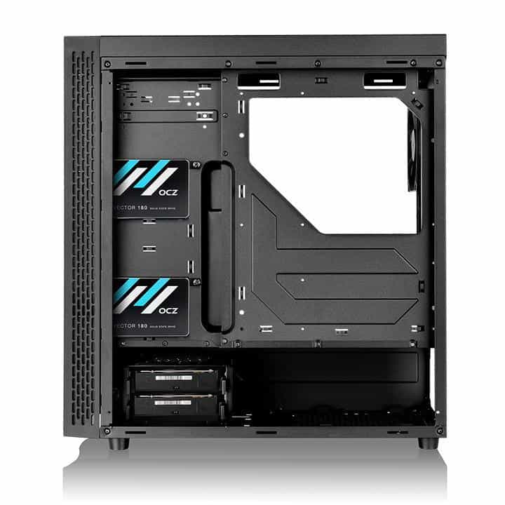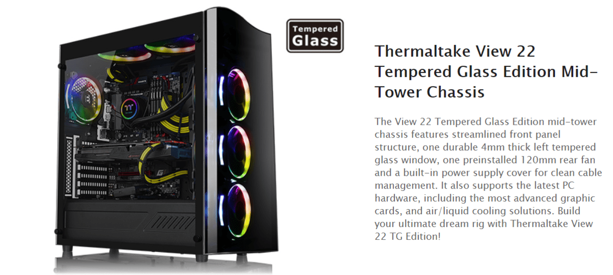At this price, I would class it as a budget option, but that does not mean it lacks in features. Thermaltake have managed to squeeze in a considerable number of premium features into this affordable option including:4 mm Thick Left Tempered Glass Window DesignThe 4 mm thick left tempered glass panel guarantees the durability of the window and display your build with crisp clarity.Streamlined Front Panel StructureFront panel adopts streamlined curve design to give the chassis a sleek and dynamic look.Built-in PSU CoverThe View 22 TG is equipped with a full-length PSU cover to hide those unsightly cables from view and give your build a sleek and tidy look, and what’s more, a better airflow.Tool-Free InstallationThe View 22 TG comes with tool-free drive cages to provide the ease of installation/removal and maximize the interior space for highly customizable layouts. Users get to mount up to two 2.5″ HDD inside the left side panel or on the PSU cover. There are also dual removable, interchangeable HDD drive bays held in the PSU cover which allow for position adjustment according to the PSU length.Dust ReductionSuperfine front filter, front panel filter, and bottom filter come with excellent protection and reduction against dirt and dust.Supports High-End PCs with Outstanding ExpandabilityThe View 22 TG guarantees outstanding expandability, supporting a tower CPU cooler with maximum height 160mm, a dual expansion slot VGA of up to 400mm in length without HDD rack, and a power supply with length of up to 160mm; plus, it has the ability to accommodate multiple 3.5″/2.5″ storage devices at the same time.Superior Cooling CapabilityThe View 22 TG is optimized for superior cooling capability with a mesh panel design and a preinstalled 120mm rear fan. The case can house up to dual 140mm intake fans and one 360mm radiator, allowing users to build a complete high-end system.Design & Build Quality
