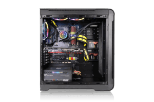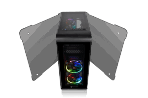 £127.99 on Amazon putting it somewhere in the middle ground of pricing for mid-towered cases and Thermaltake has done their best to tick all the boxes for current PC gamer trends. This has tempered glass panels on both sides, so your cabling skills will need to be top notch, there is also tempered glass on the top and front of the case. It has 3 RGB fans pre-installed which can be controlled via the built-in fan hub.