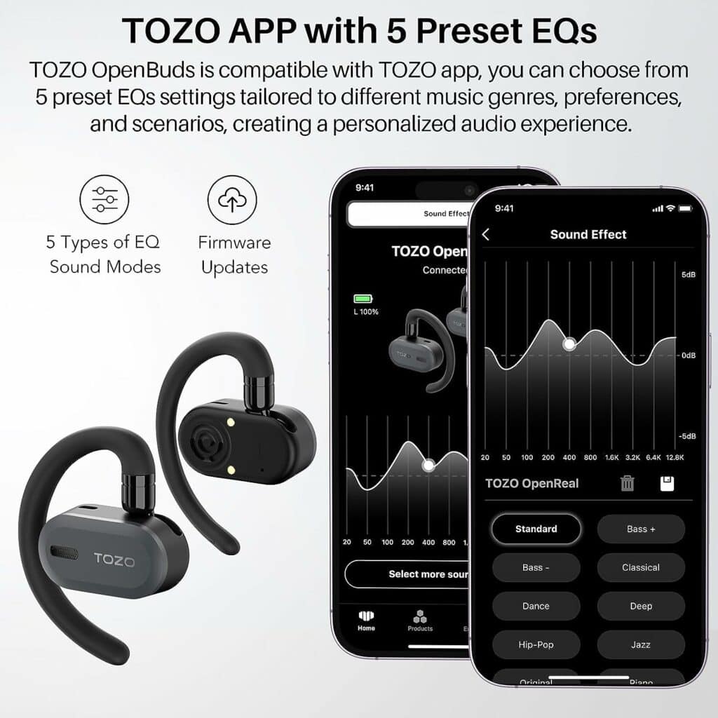The Tozo OpenBuds are complemented by the Tozo app available on both Android and iOS platforms. The app offers a range of features, including firmware updates and five preset EQ settings. The EQ settings range from Standard, Bass +, Classical, Dance, to Treble +. Despite the lack of customisation in the EQ settings, the app still provides enough flexibility to suit most users’ preferences. The app also allows for the remapping of the touch controls, adding to the versatility of the OpenBuds.