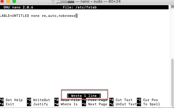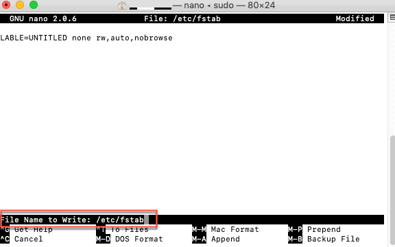 Step 4: Copy and paste the command LABEL=VOLUM_NAME nono ntfs rw,auto,nobrowse and hit Enter. Change the VOLUME_NAME to the name of your external hard drive. If you have multiple NTFS drives/volumes to write, write different line for each of them. Then hit Enter.