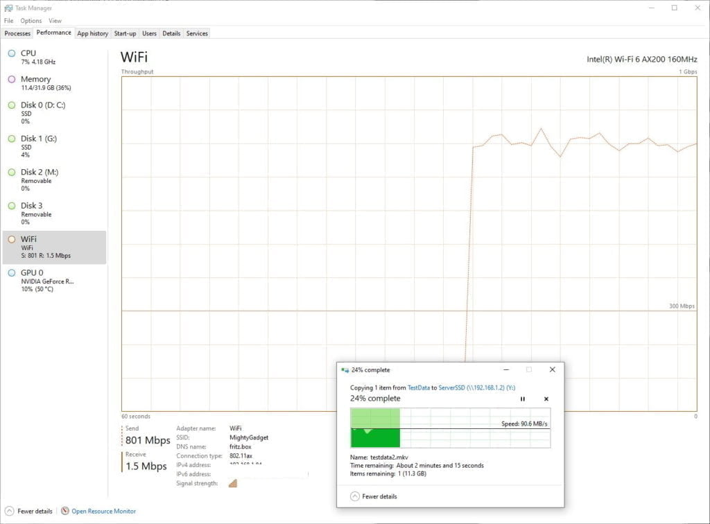 With this test, I was able to achieve a relatively consistent 800Mbps in task manager and the file transferring at 90MB/s.