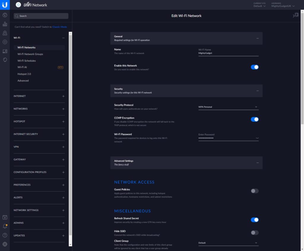 One minor thing, there doesn’t appear to be an obvious way to run 2.4Ghz and 5Ghz SSIDs with completely unique settings. So for example, I can’t seem to have the 2.4Ghz network on its own unique name with its own VLAN. There is a good chance this is possible, but as I am new to this system, I have probably missed something obvious.