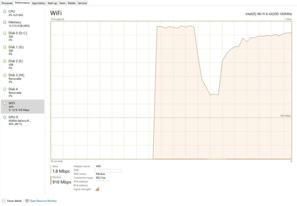 With iPerf3 there doesn’t seem to be much gain to be had when using 160Mhz vs 80mhz the PC reports transfer speeds regularly in excess of 900 Mbits/sec. This is an outstanding speed for Wi-Fi 6 on 80Mhz.