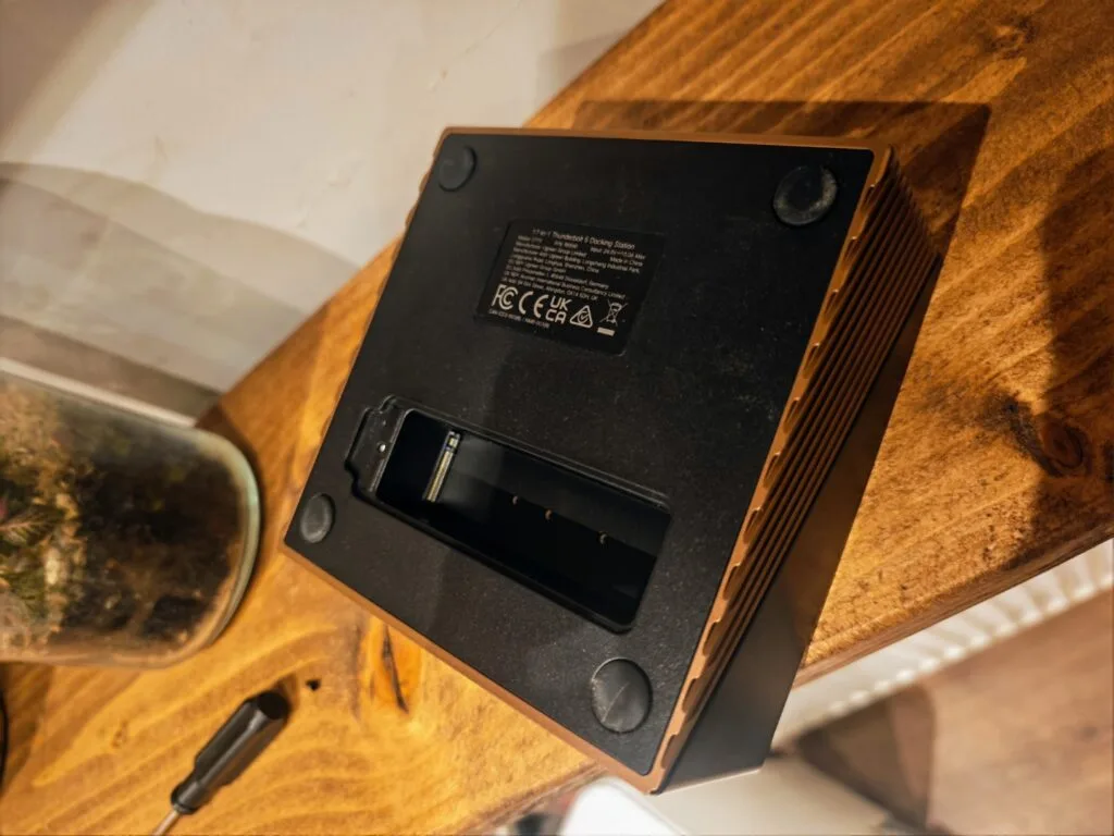 The M.2 NVMe slot is accessible from the underside of the dock. The NVMe enclosure section is quite deep, and the cover plate has a built-in passive radiator to help with cooling – a thoughtful addition, as NVMe drives can run hot under sustained workloads.