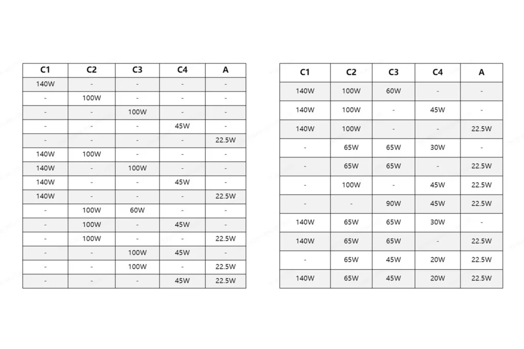 - USB-C1, C4, and USB-A1, you will get 140W/45W/22.5W.