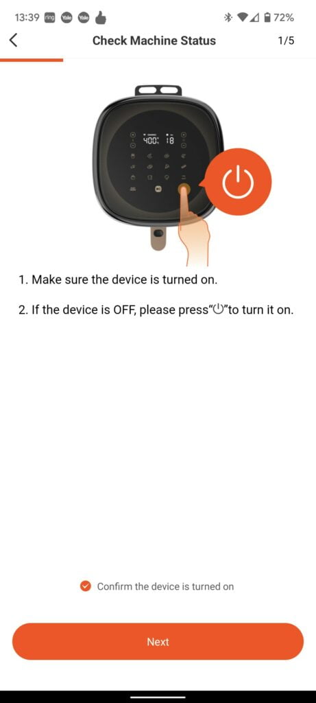 The air fryer needs to be switched on, then you hold down the power button for five seconds to put it into pairing mode and follow the instructions.