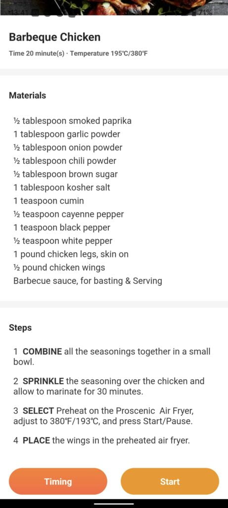With the air fryer set up, you can control everything via the app. You can manually start the air fryer by selecting the temperate and time. Using the timing button within the app you can set delay the air fryer starting by up to 4 hours.