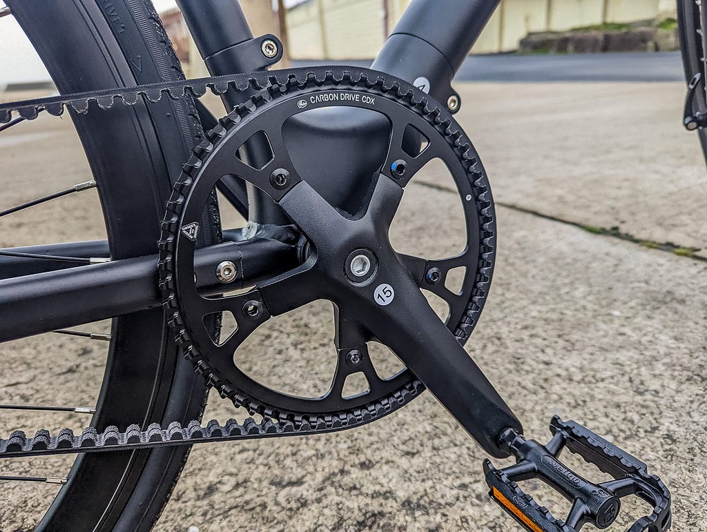 Then the bike is a fixie, having just one gear, and it is belt driven. The benefits of a belt-driven bike are that it requires significantly less maintenance. The belt doesn’t rust or need lubrication, they are often regarded as maintenance-free and have become a popular option for people going on long tours for this exact reason.