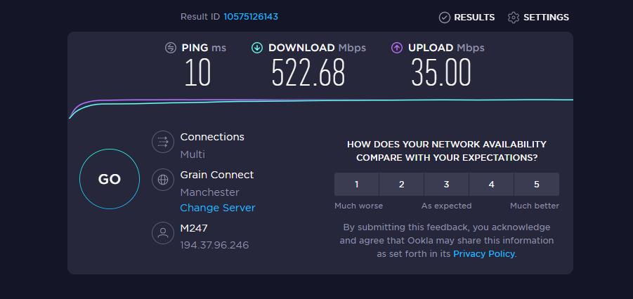 - For Surfshark – almost identical to my Virgin speed using the Manchester server. 8ms ping, 527Mbps download, 35Mbps upload. At the time of writing, I re-did this test multiple times, because I am sure it is not that good, normally.