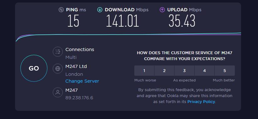 - OVPN: 141.22Mbps / 35 Mbps and 15ms Ping