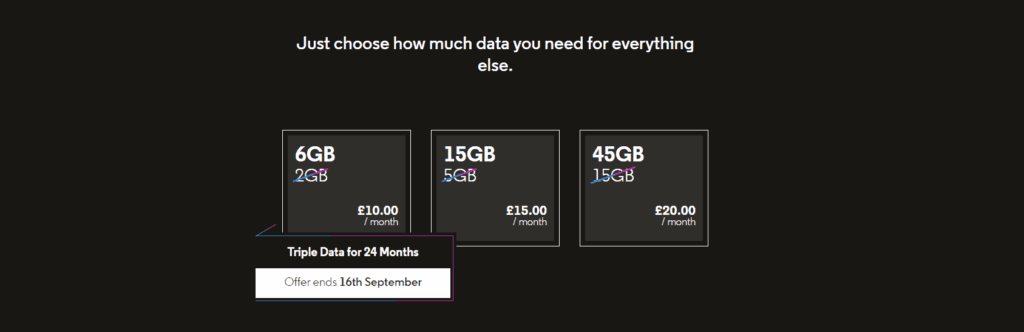 Voxi offers 3 plans but then you can add other services. The three options are 2GB, 5GB and 15GB at £10, £15, and £20 per month. If you subscribe before 16th of September you get triple data giving you 6GB/15GB/45GB. All the options have unlimited calls and texts presumably because under 30s use neither of these options. At the moment they also offer a free phone case when you sign up and you will get a voucher a few days after activating.