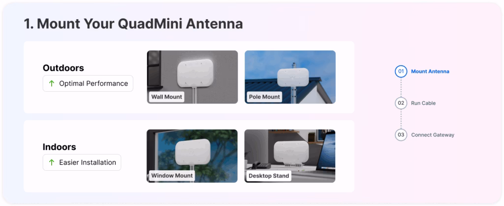 The key distinction lies in the antenna type and resulting performance characteristics. The QuadPro is a directional panel antenna with significantly higher gain figures – up to 11.5 dBi compared to the QuadMini’s maximum 5.8 dBi. This higher gain translates to better signal reception, but only when the antenna is properly aligned with the serving cell tower.