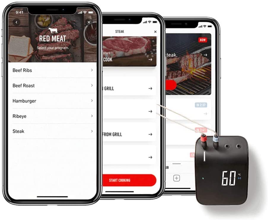 - Select food doneness (ex. medium-rare steak) and receive an alert once it has reached the perfect temperature to serve.