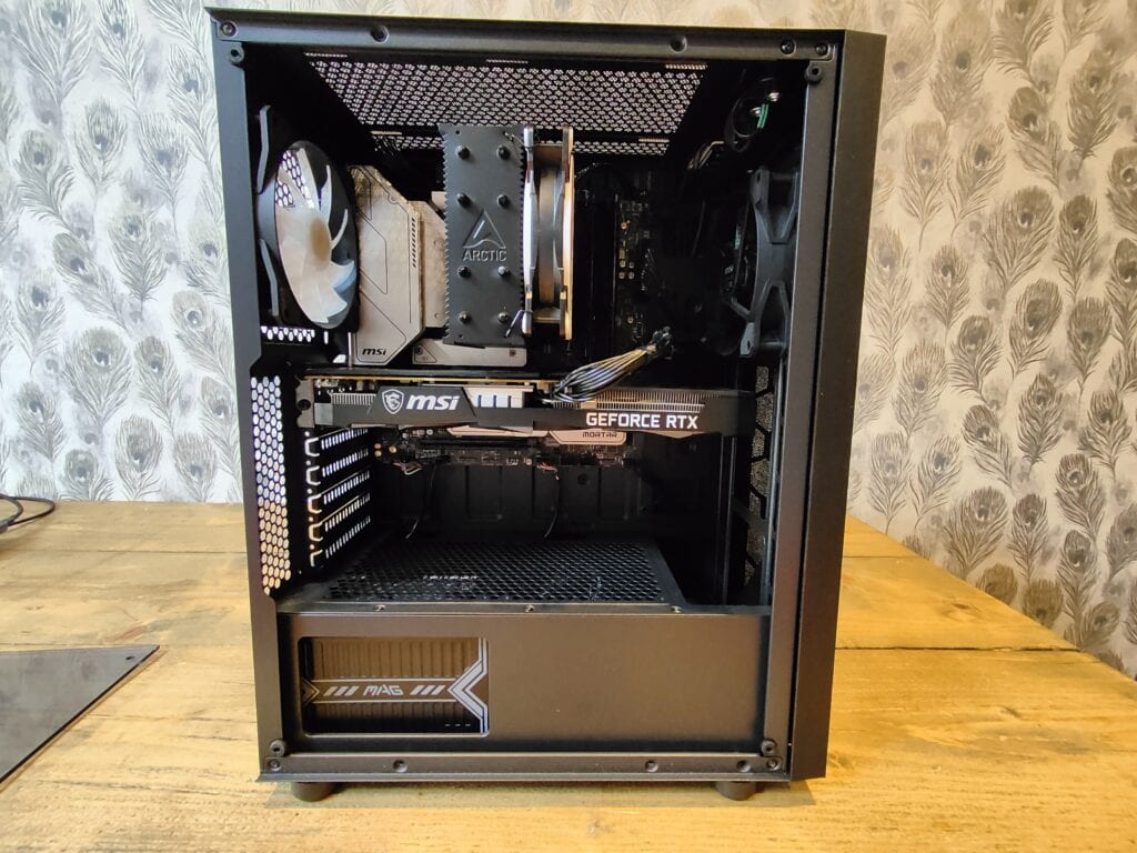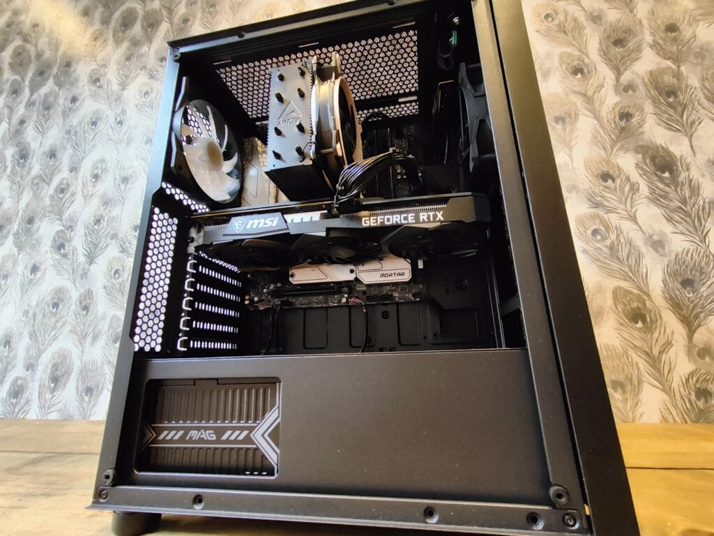 This PC uses the latest 12th gen Intel Core i5 12400F CPU and an MSI Nvidia Ventus 2X RTX 3060 GPU. To keep costs down, the motherboard is a DDR4 compatible micro-ATX MAG B660M Mortar.