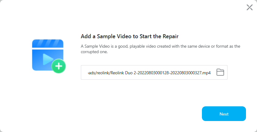 From here, Recoverit asked me to provide a sample of a working video, ideally from the same device and in the same format. Out of laziness, I chose a video that was from a different reolink camera, and this also failed. It took quite a few attempts to find a working video that could then be used to restore the broken video successfully. But eventually, I got there.