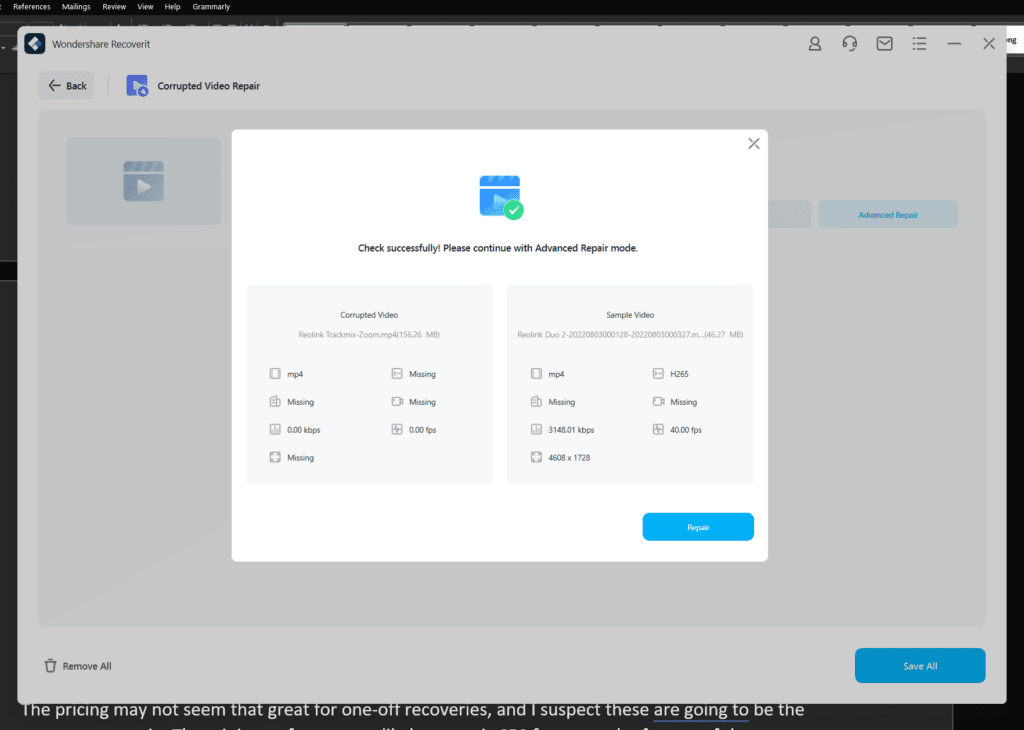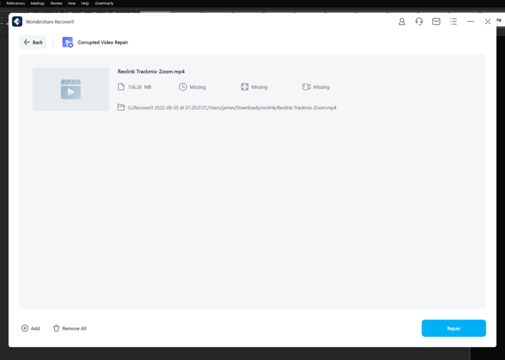 Video recovery is a bit more complex. The actual process is simple enough, but it takes a little bit of trial and error to successfully repair the video.