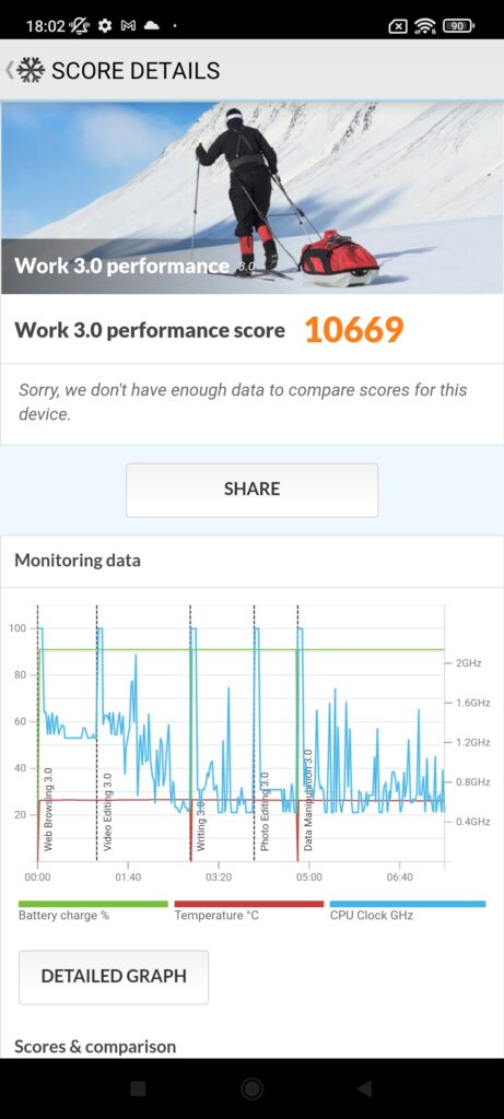 The official benchmarks show it scoring 4179 with a stability score of 93%. This is almost the same high score for the OnePlus Nord 2, but the OnePlus had afar worse stability score of 70.5% stability. The benchmarks I ran showed it running perfectly until 15 minutes, then suffered a significant drop off going down to 2932. It was, however, much more stable than most Snapdragon 888 phones.