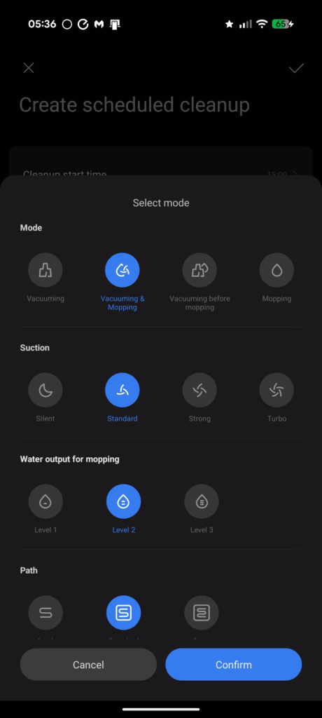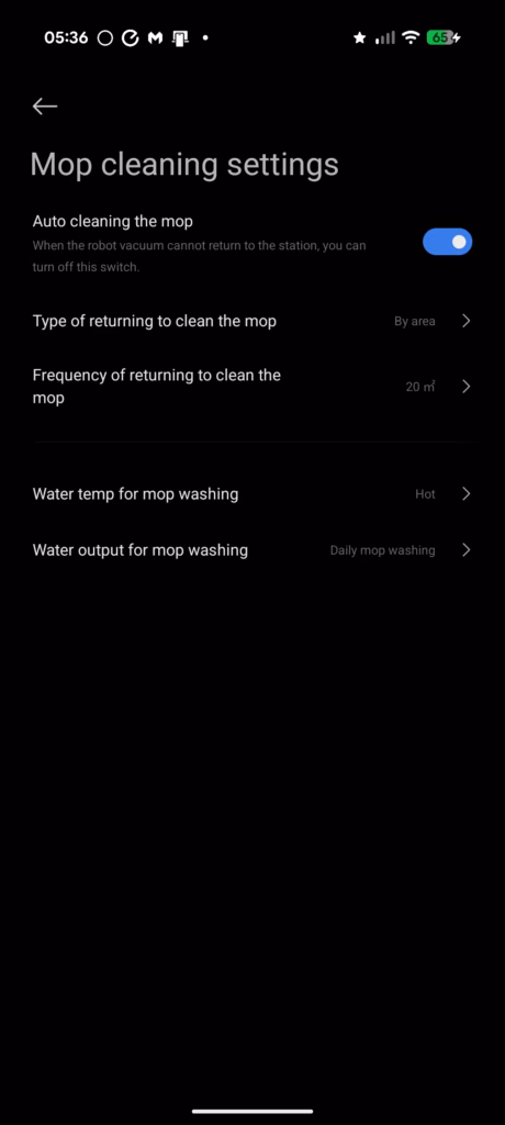 Xiaomi is no exception. I have a daily schedule set up where I have suction set to strong and the water output for mopping set to maximum, and the path set to deep. The vacuum completes the cleaning in one pass, taking around 75 minutes.
