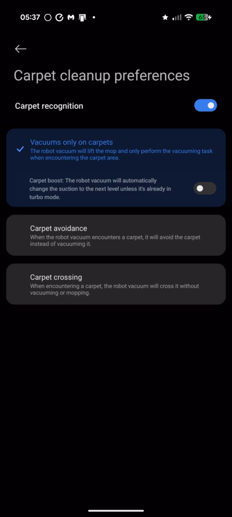 On carpets and rugs, performance is similarly good. I have a couple of low-pile rugs in the living room and a medium-pile rug in the bedroom. The vacuum transitions onto these without hesitation, and the automatic suction boost (when using smart mode) kicks in reliably. Carpet cleaning results are thorough – after a pass, the rugs look noticeably cleaner, with embedded dust and hair effectively extracted.