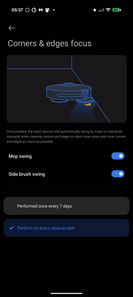 Edge cleaning is a genuine improvement over standard robot vacuums. The extending side brush makes a noticeable difference, sweeping debris from along the skirting boards that would normally be left behind.