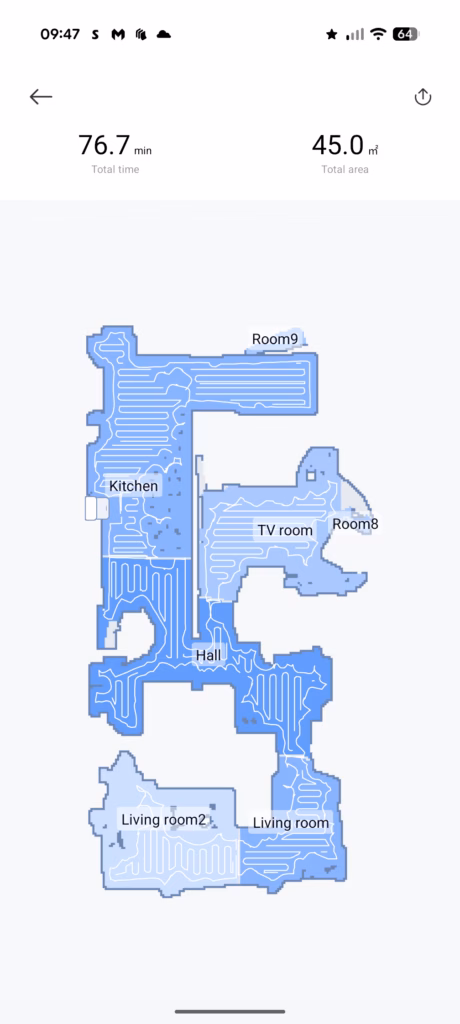 Route planning is logical. It follows a methodical back-and-forth pattern in open spaces and navigates around obstacles without excessive ping-ponging. One minor criticism: it sometimes makes odd detours that don’t seem necessary, adding a few minutes to the cleaning cycle. I suspect this is related to its edge-cleaning behaviour, where it might deviate from the optimal path to ensure it covers wall edges properly.
