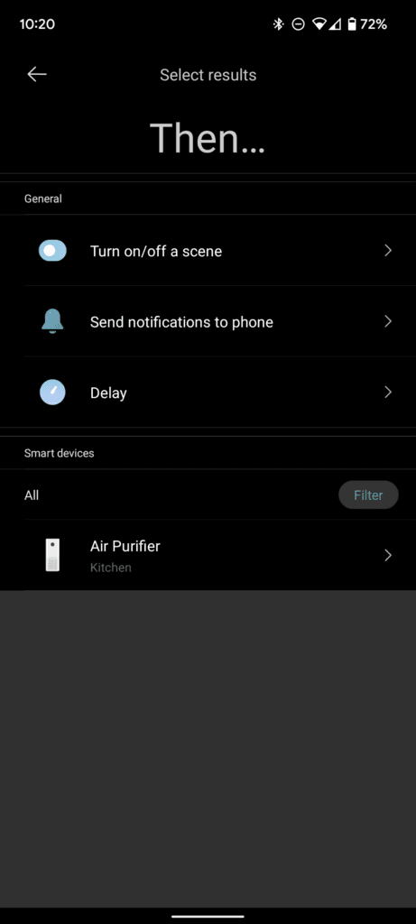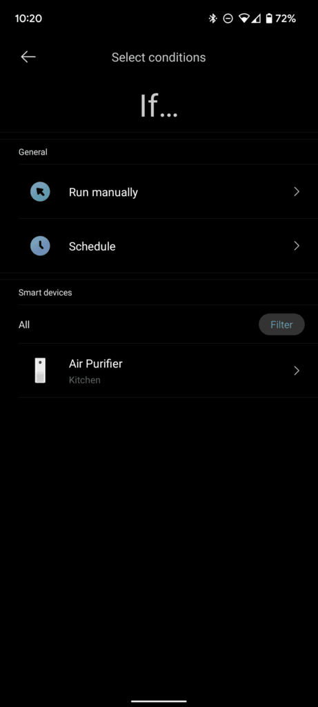 Unfortunately, I only have one Mi Home device, so the scenes I can create are very basic. Under the If condition, I have the usual time-based schedules, but I can also activate events based on the sensors within the air purifier. This includes: