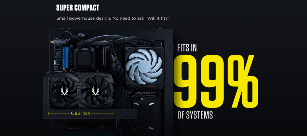 While this is a two fan design, it uses a compact PCB making it considerably smaller than the Gigabyte GTX1650 I previously used. This is perfect for small form factor PCs and Zotac claims that it can fit in 99 percent of systems.