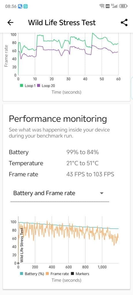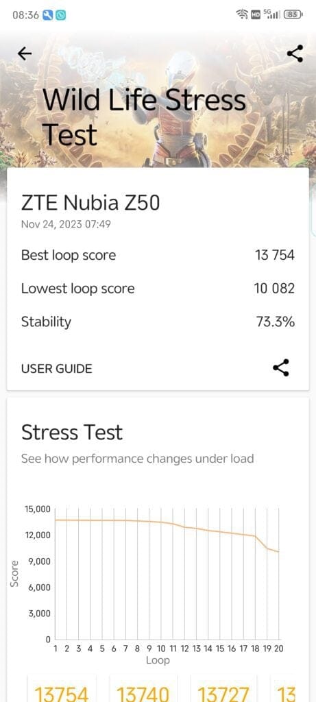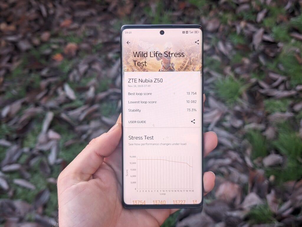 ZTE/Nubia appears to favour performance over efficiency, and in the 3DMark Wildlife Stress Test, it achieved a score of 13754 for the best loop and 10082 for the lowest loop, giving it a stability of 73.3%. This is far better than the Honor Magic5 Pro, but the caveat is the temperature whet form 21° to 55°, which is significantly higher than most normal phones. You’d typically see 44° as the maximum temperature.