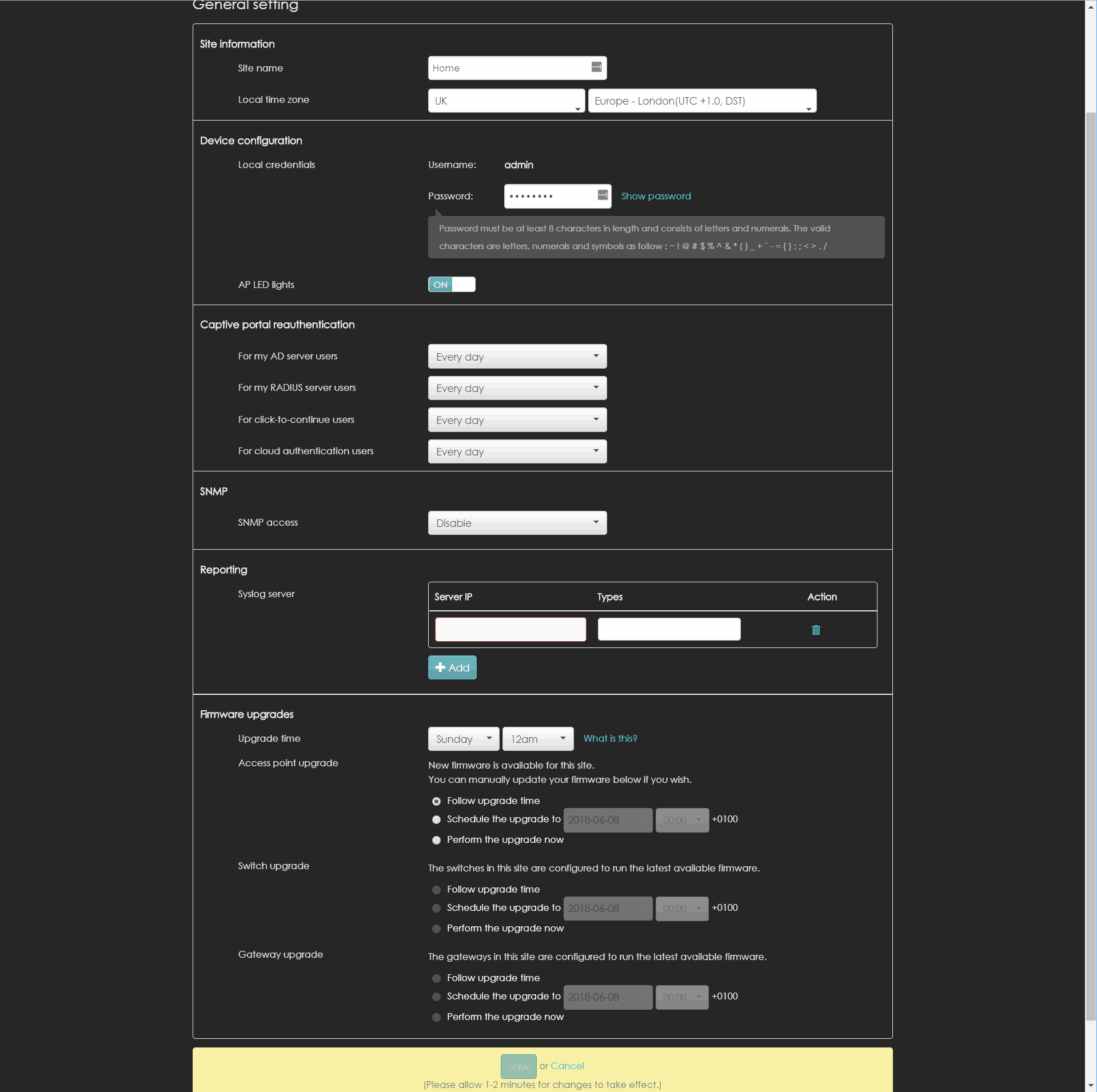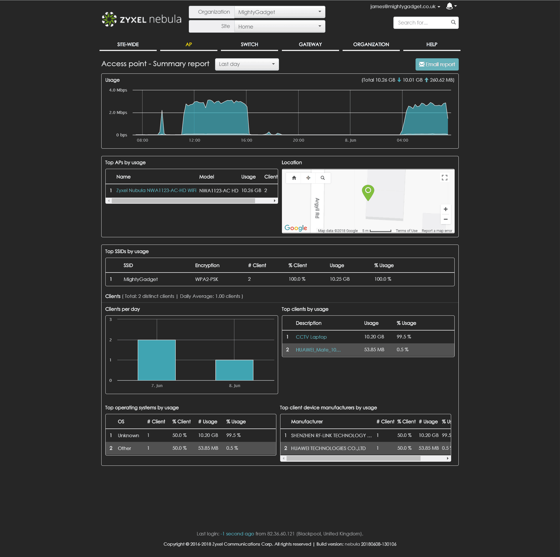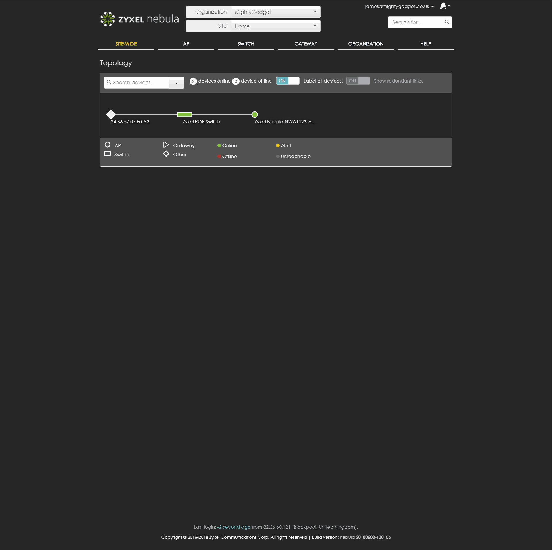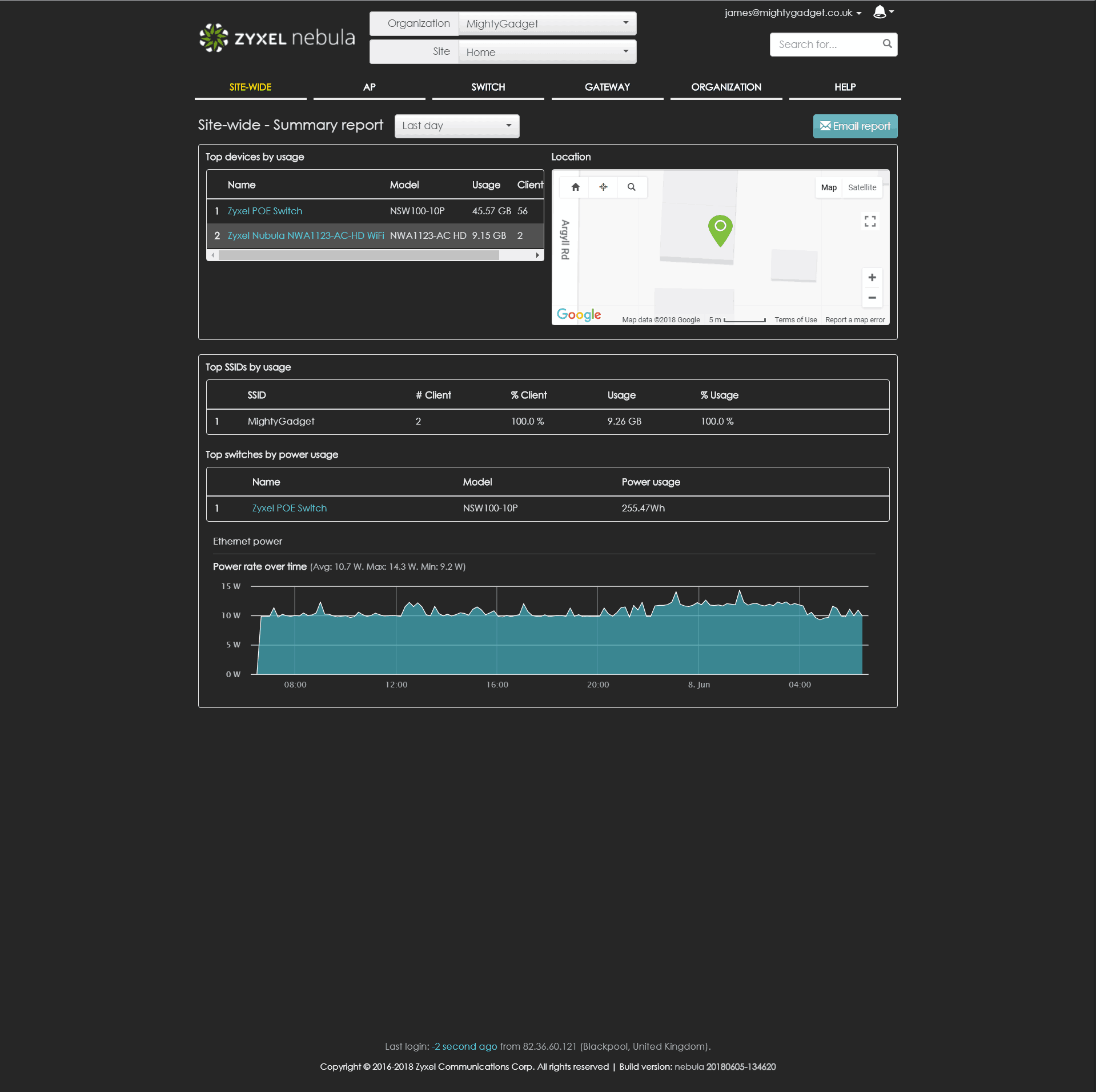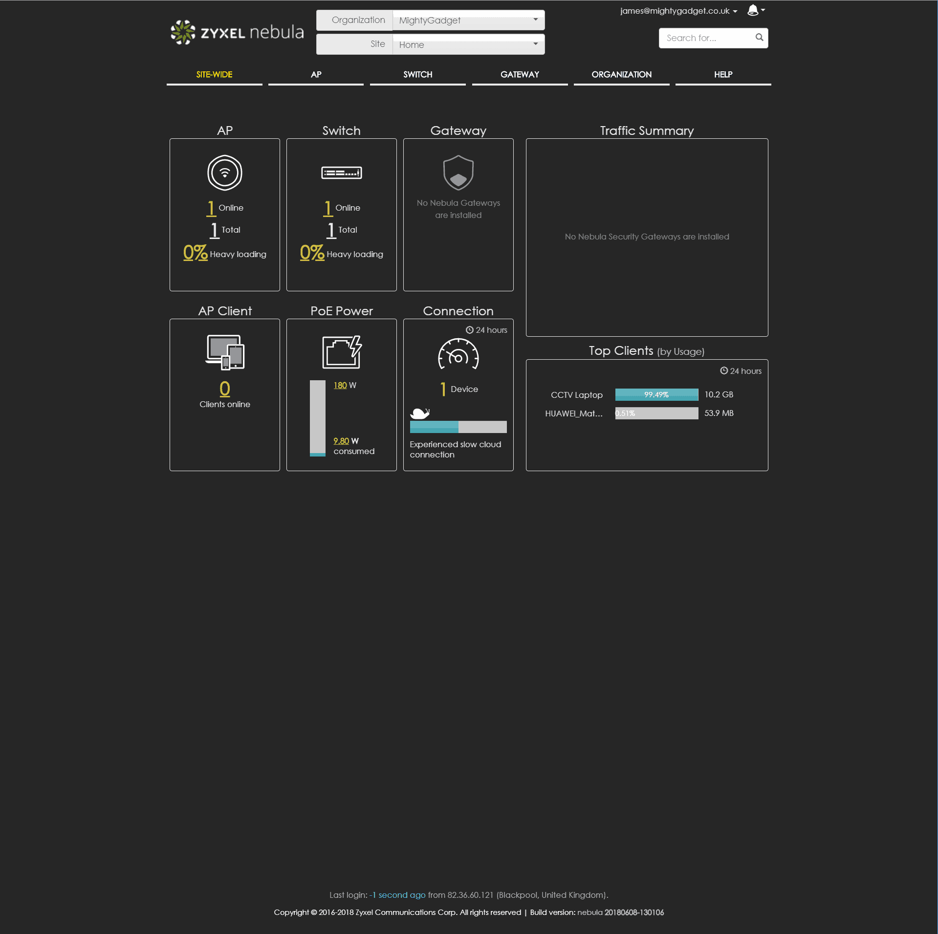 This is where all the fun happens, it has been a long time since I tested Meraki, and I only played around with it, but from memory, the Nebula system is quite similar but considerably cheaper. There are so many things to manage I will probably miss a few bits or just cover them briefly, from my limited networking experience this is a comprehensive system.You need to sign up via nebula.zyxel.com, and this is where you manage everything, once signed up you can manage your organisation, and location, you can have multiple of each. So, for an IT company, you can unify the management of all your clients.During the set-up process, I had to set up the Wifi settings even though I hadn’t added the AP yet. When you add the AP later, the settings get pushed through automatically. You can apply settings for everything on the network before you add a single device and everything will be pushed out automatically when added, this is a huge selling point for businesses.Once the basic settings are done, you can begin registering your devices; this is done by inserting the mac address and serial number. The process is quick and painless as long as you have the details to hand. You can also optionally use the Zyxel mobile app to add devices. I was hoping this would offer more functionality allowing management similar to the Netgear, but sadly not. Zyxel have confirmed they will be launching a new app in September with more functionality.Under general settings, you have the option to set the local credentials for devices, set up SNMP access and you can enable reporting to a syslog server.Similar to the Netgear you can get alert settings sent to you, though with Nebula you can customise what and when they get sent. As I have had issues with things going down in the past I love this feature and have it enabled if the AP or switch goes down, then also if any port on the switch goes down. This should allow me to quickly fix any issues when they occur, it is great for my use, but would be amazing for someone managing a large network or multiple clients.As you would expect there are some good reporting features, you can access a site-wide summary report which shows all your devices, their usage as well as power used for the POE switch. Similar to Meraki you can view a topology of your Nebula devices and a floorplan of the network layout. Using two devices doesn’t provide the most exciting topology, but it is obviously a great feature for managing a larger network.