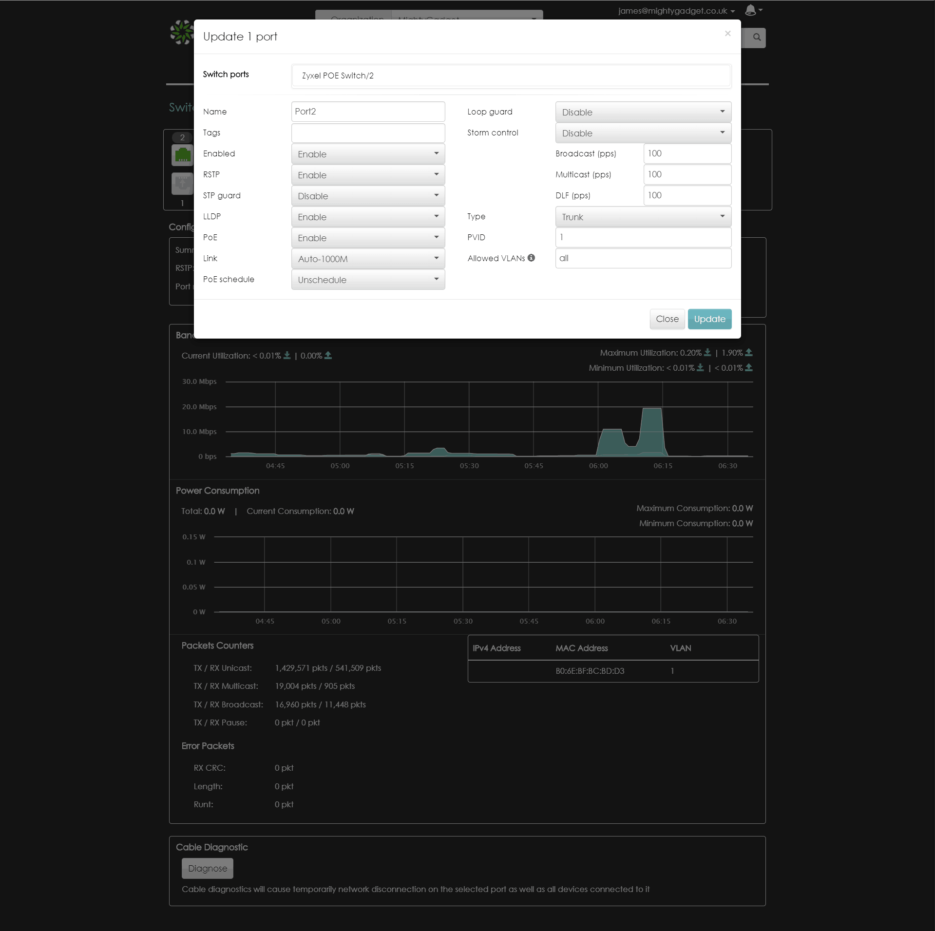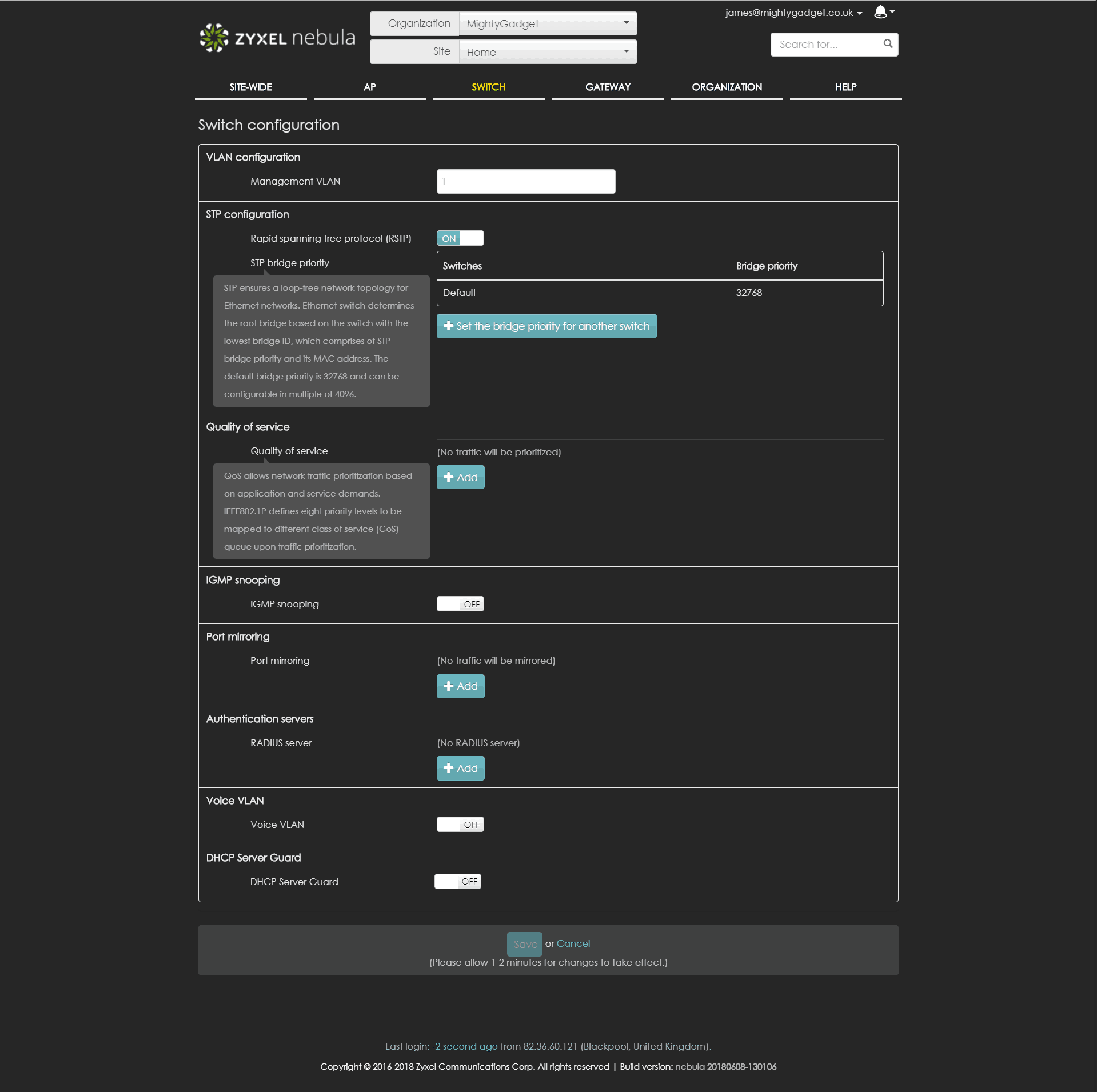I have to admit I do love the Nebula system, the functionality is well beyond what I need or understand, but it offers a level of management significantly above and beyond what the Netgear Insight can do. While it is not a particularly advanced feature or uncommon for routers, I love being able to name all my devices and ports for easy management.While my limited setup didn’t make the most of the zero-deployment settings, I can appreciate the time and money it would save when setting up a new network in an office. Once set-up, the process took a few minutes and required zero intervention on my part.I have had zero issues with performance or stability (unlike Netgear), and it has worked perfectly for me.That being said, how great it is will be use dependant. I think I have gone a bit beyond the realms of what is needed for my home/office business use, and the loud fan will be off-putting for any advanced home users considering it. Pricing isn’t too expensive, but again, more expensive than a home user needs at £177.49 for the switch, though the AP is only £74.99.If you are a small business, or even larger, and the cost plus licence fees of Meraki are off-putting, then this could be a fantastic alternative. I would say the main downside for some business would be the limited range of devices available. The largest switch is the Zyxel NSW200-28P which has 24 copper ports and 4 10Gbit SFP ports. Though at a price of £682.13 inc VAT and a 375-watt high power budget it seems like an affordable solution for an office. With this being a relatively new ranger of networking gear, there are new products coming and Zyxel say a 48-port model will be launched in September.The product range isn’t just limited to switches and access points. They do have a firewall gateway in the form of the NSG100 which has dual WAN ports for failover and four Gigabit LAN ports, and the firewall throughput is 450 Mbits/sec UDP packets or 300 Mbits/sec TCP packets. I didn’t have a chance to use this, but the level of management features appears to be excellent, similar to the other devices.While the system is a bit more expensive the Ubiquiti and Netgear Insight, it is vastly superior to the Netgear at least. The system is much more comparable to the Meraki offering, and to put the price into perspective, the cheapest Meraki switches with no licence, eight ports + 2 SFP costs £559 which is over three times the cost of the Zyxel equivalent. Without a licence the Meraki devices are useless, and the cost of the licence varies depending on the device with many of them costing over £100 per year.